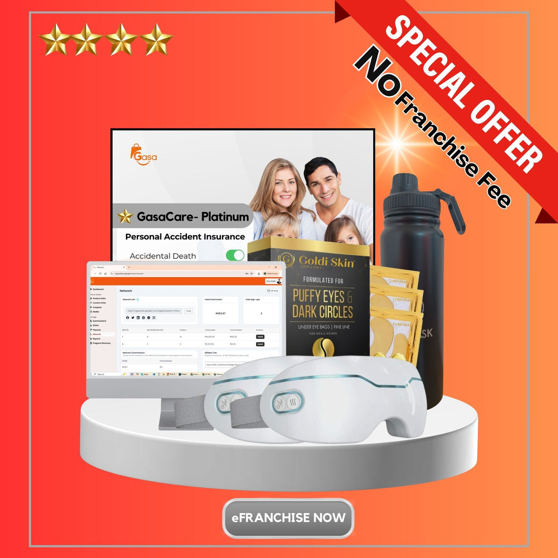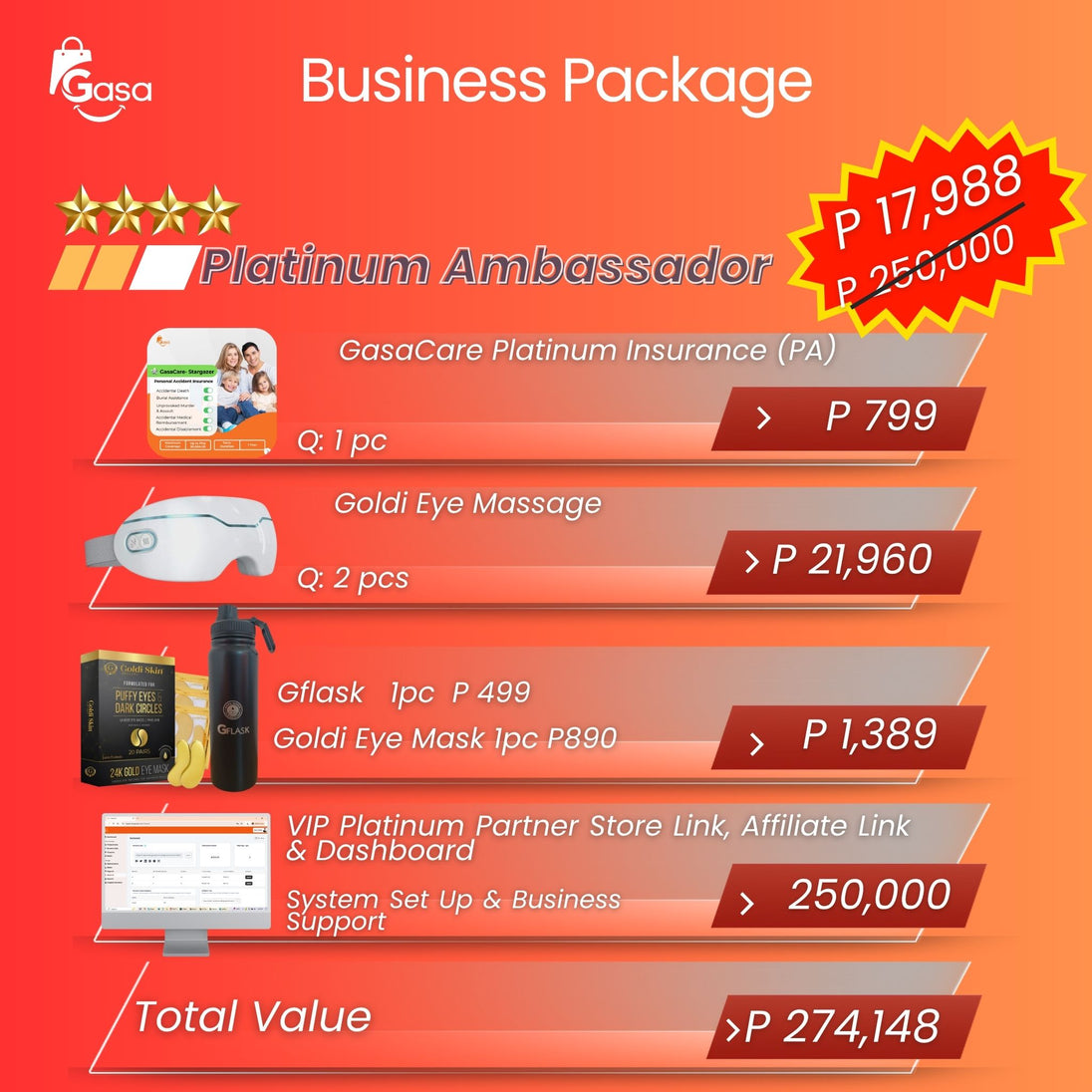 Business Ambassador Platinum Package - 1 Gasa Insurance, 2 Goldi Eye Massage Device, 1 Gflask, 1 Goldi Eye Mask